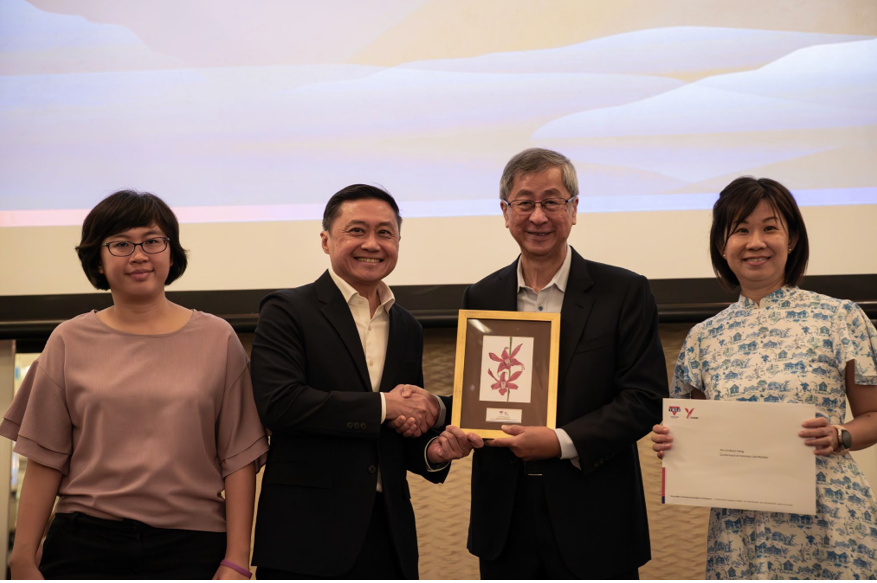 Guest of Honour Mr Lim Boon Heng, Honorary Life Member of YMCA of Singapore received a token of appreciation from Mr Tony Soh, President of YMCA of Singapore during the Find Your Y: Giving Gala 2025. They were joined by Ms Wu Mei Ling, General Secretary and CEO of the YMCA of Singapore (in blue).