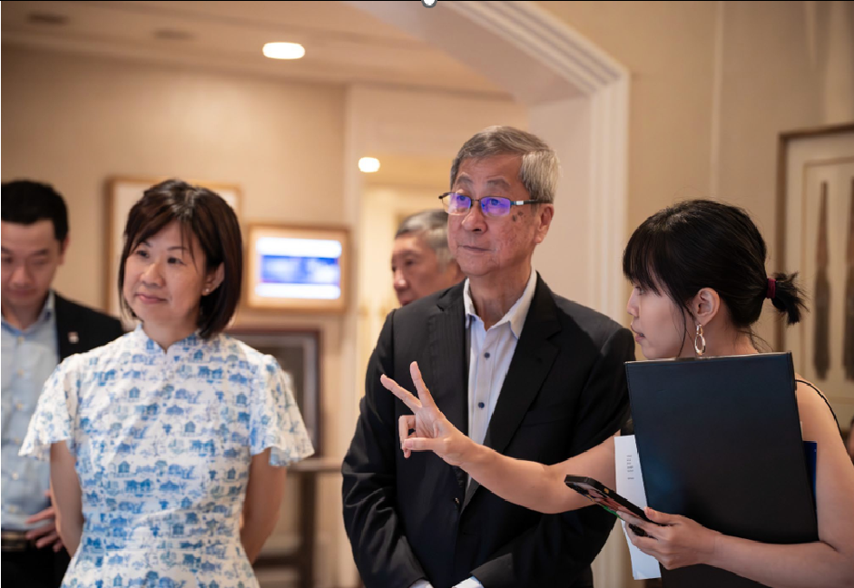Guest of Honour Mr Lim Boon Heng (centre) toured the silent auction showcase, accompanied by Ms Wu Mei Ling, General Secretary and CEO of the YMCA of Singapore (in blue).